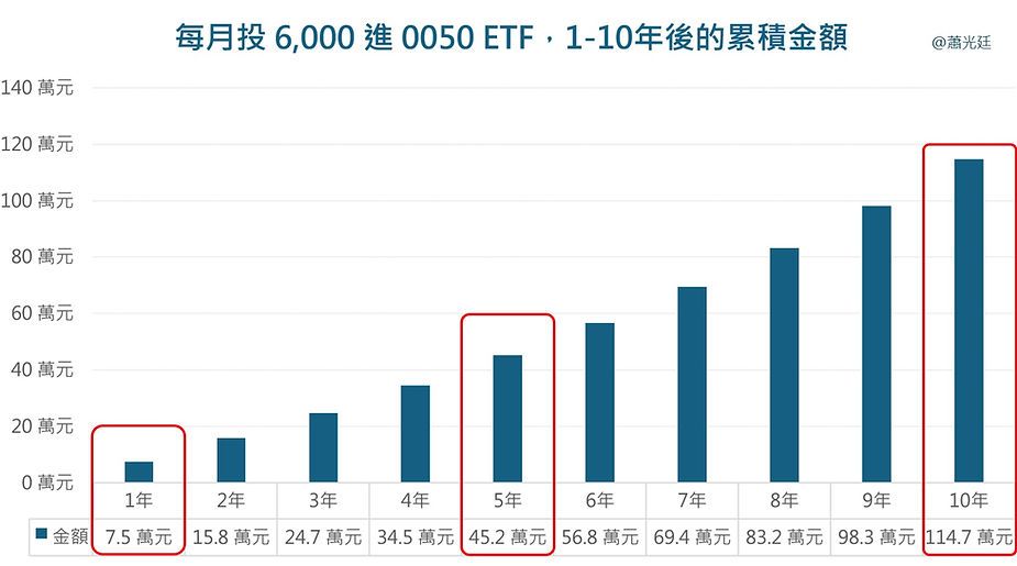 下圖顯示,如果每個月存6,000元到0050,經過1年、5年和10年後的帳戶金額: