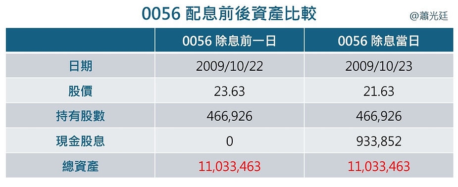 所以,老陳看起來雖然多拿了93萬多元現金,但手上的 0056也同時少了差不多一樣的價值。從下表可以很清楚看到,除息那一刻,老陳的總資產其實沒有變多,還是原本那個數字。