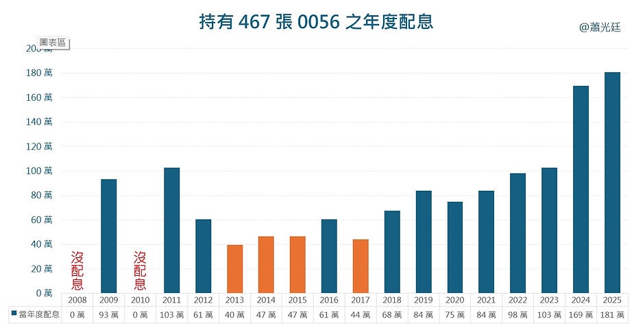以下圖表是根據0056歷年的配息,算出老陳手上大約467張的0056,從2008年到2025年,每年到底能提供老陳多少的生活費。